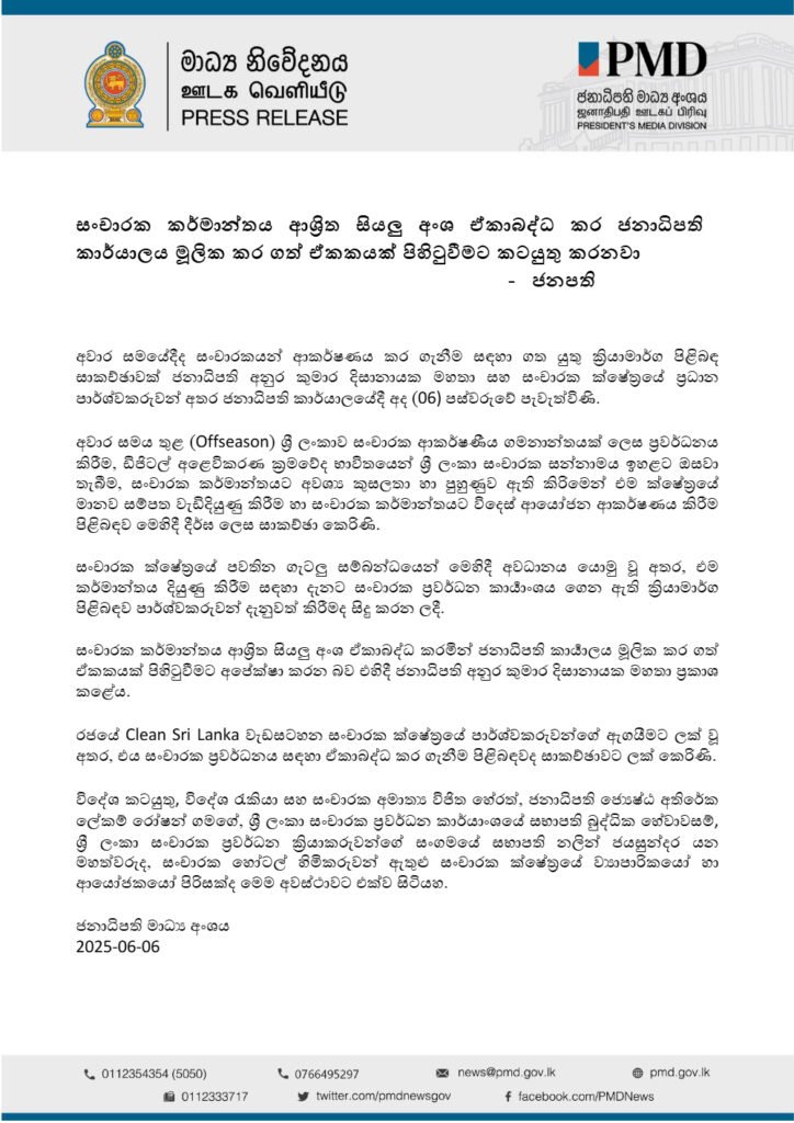 අවාර සමයේදී ද සංචාරකයන් මෙරටට ආකර්ෂණය කර ගැනීම සඳහා පුළුල් වැඩපිළිවෙළක් ක්රියාත්මක කිරීමට ජනාධිපති අනුර කුමාර දිසානායක මහතාගේ අවධානය යොමු වී ඇත. ඊයේ (ජූනි 6) පස්වරුවේ ජනාධිපති කාර්යාලයේදී සංචාරක ක්ෂේත්රයේ ප්රධාන පාර්ශ්වකරුවන් සමඟ පැවති සාකච්ඡාවකදී මේ පිළිබඳව දීර්ඝ වශයෙන් සාකච්ඡා කෙරුණා.