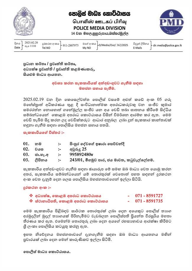 ගනේමුල්ල සංජීව ඝාතනයේ දී තුවක්කුකරුට සහාය දුන් සහ ආධාර කළ සැකකාර කාන්තාවක් හඳුනා ගැනීම සඳහා පොලිසිය මහජන සහාය පතයි.