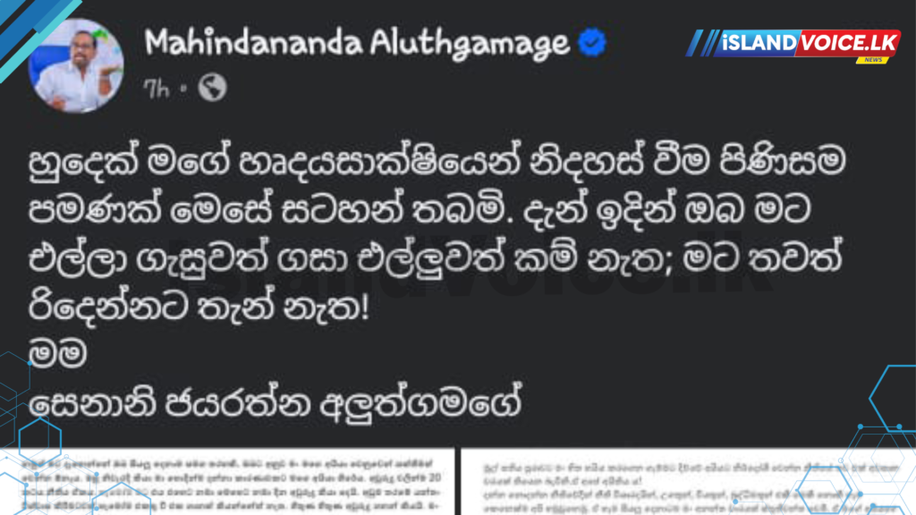 මේ සම්බන්ධයෙන් මහින්දානන්දගේ බිරිඳ සෙනානි ජයරත්න අලුත්ගමගේ ෆේස්බුක් ගිණුමේ සටහනක් ද පළ කර තිබුණි .