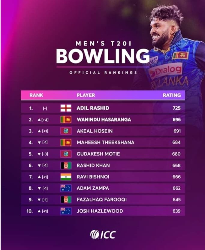 මේ අතර පන්දුවාර විස්ස තුන්ඉරියව් ක්රිඩකයන්ගේ ශ්රේණිගත කිරීම් හි වනිඳු හසරංග එක් ස්ථානයක් ඉදිරියට පැමිණ 05වැනි ස්ථානයේ පසුවෙයි.