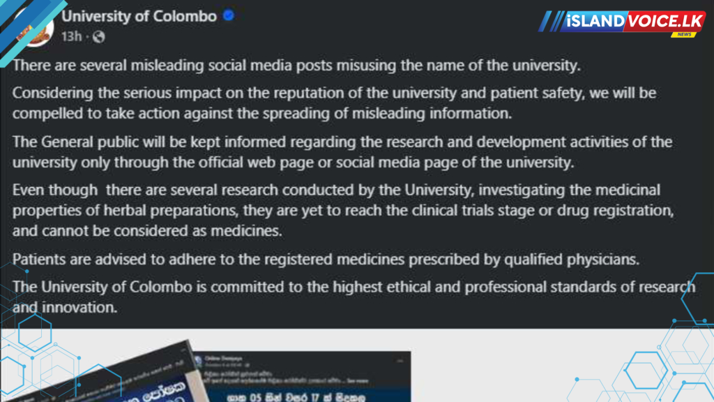 ඒ අනුව, සුදුසුකම් ලත් වෛද්යවරුන් විසින් නියම කරනු ලබන ලියාපදිංචි ඖෂධවලට පමණක් අනුගත වන ලෙස කොළඹ විශ්වවිද්යාලය මහජනතාවගෙන් ඉල්ලා සිටියි.