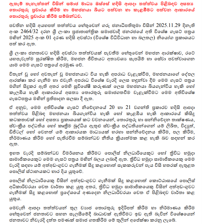 පසුගියදා ජනාධිපතිවරයා විසින් නිකුත් කළ හදිසි අවස්ථා ගැසට් පත්රය මගින් එවැනි පුද්ගලයන්ට එරෙහිව පියවරගැනීම සඳහා නීතිමය ප්රතිපාදන ලබාදී ඇති බවයි එම නිවේදනයේ සඳහන් වන්නේ.